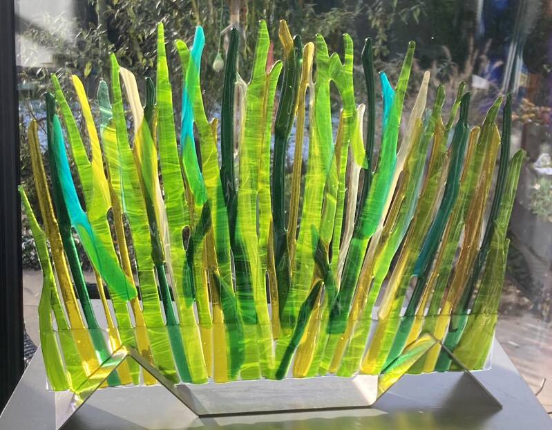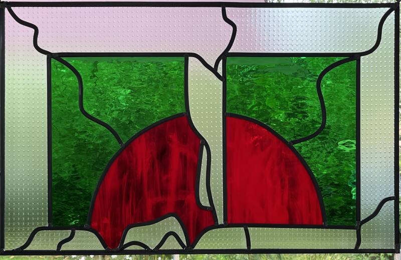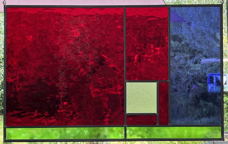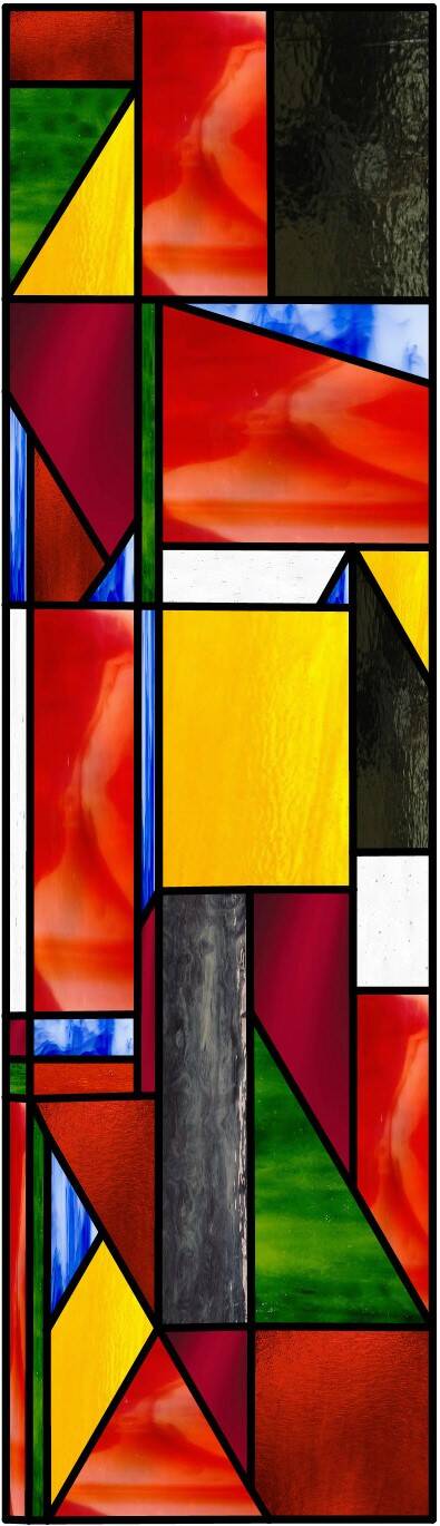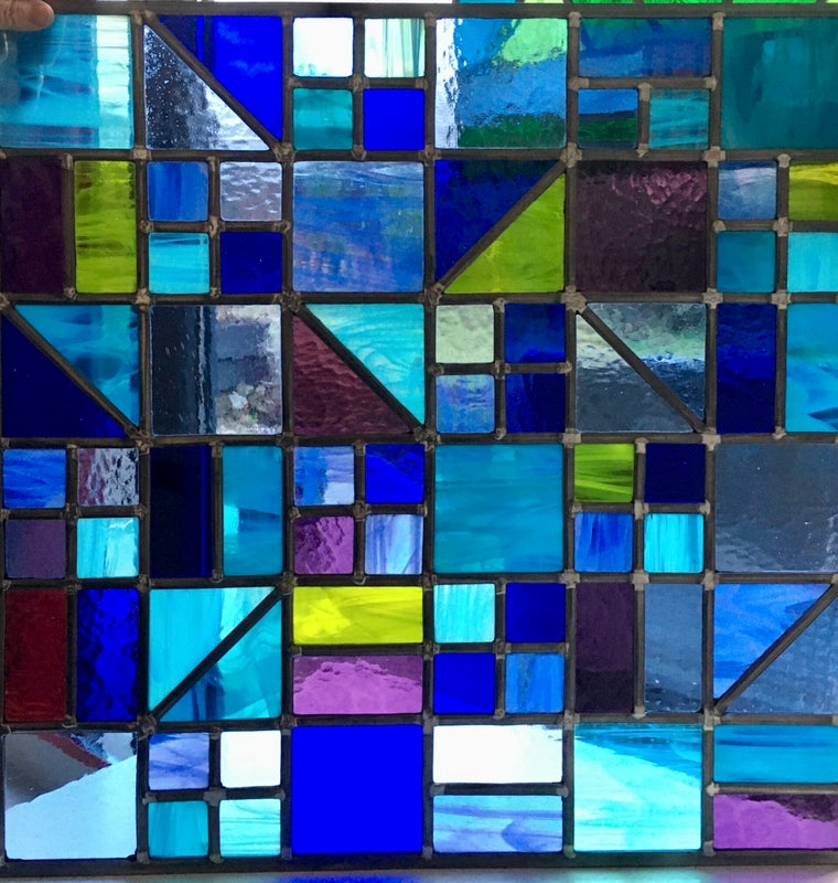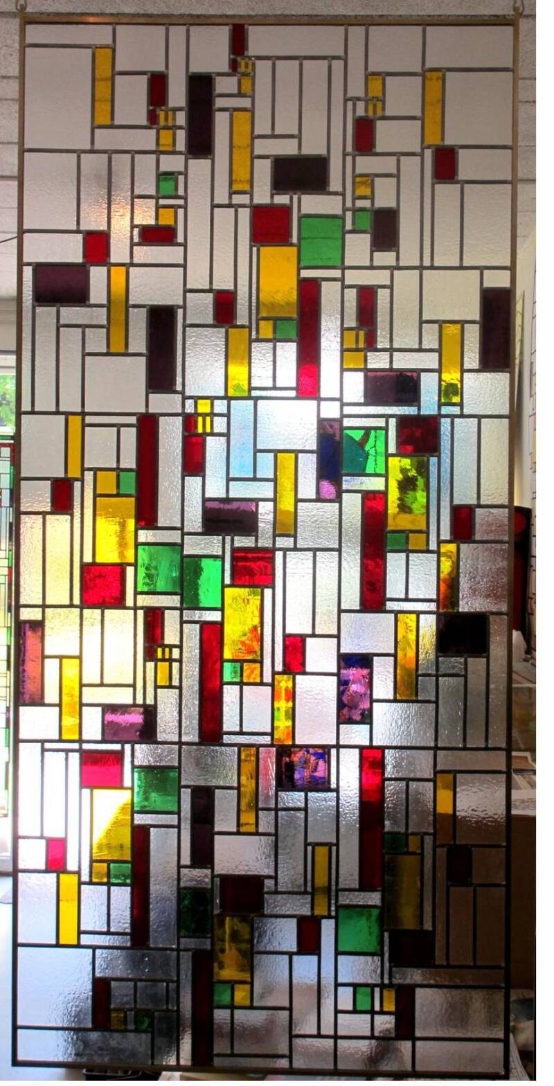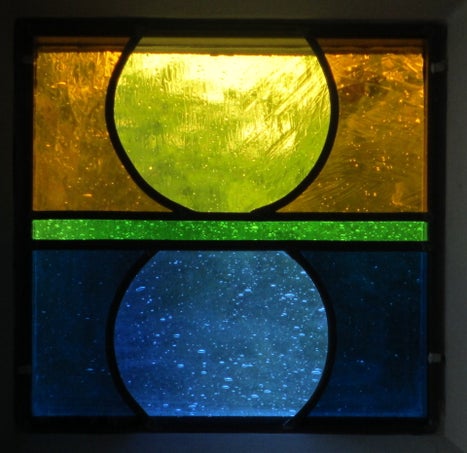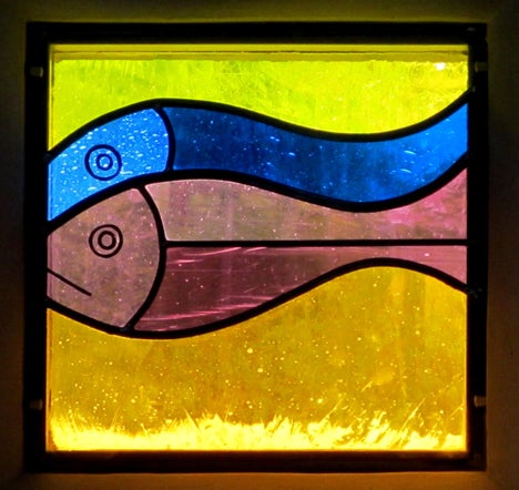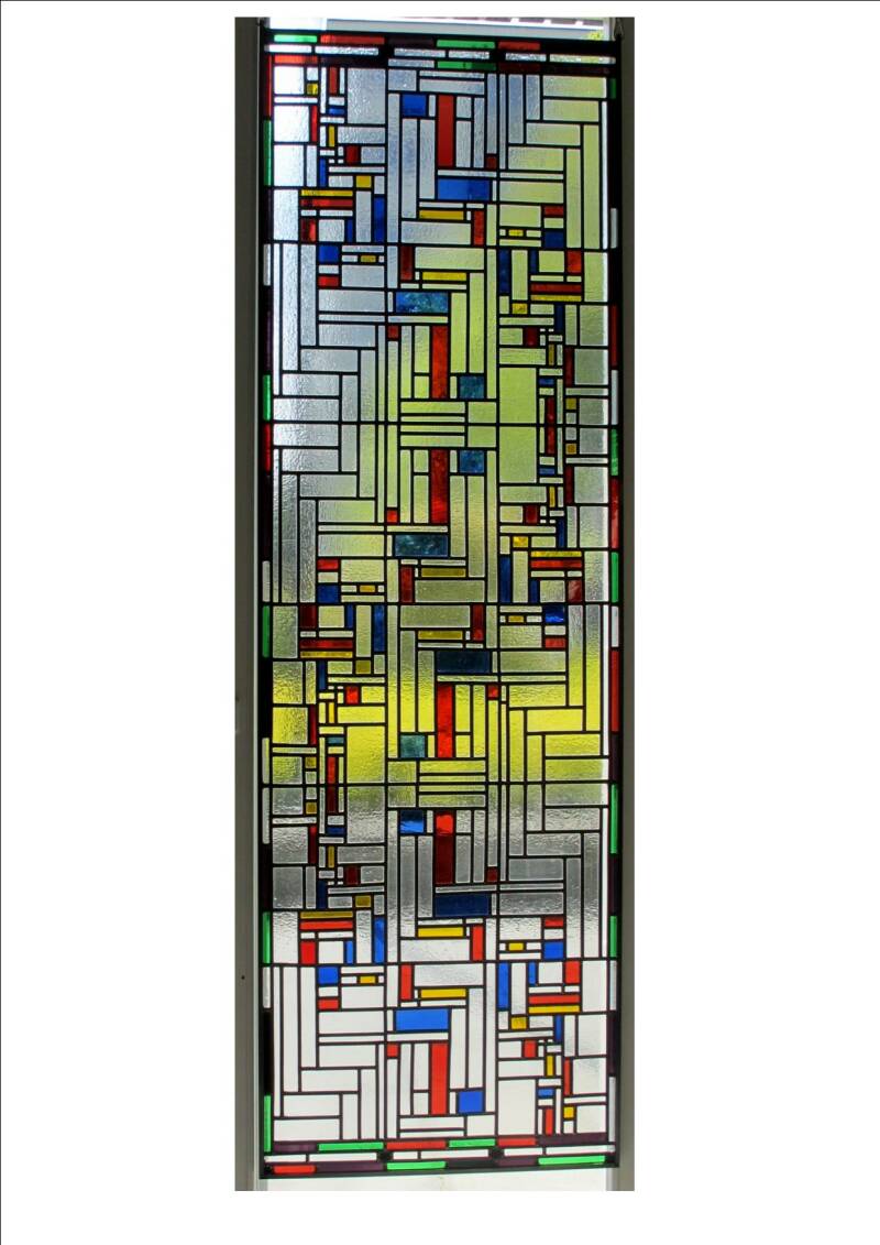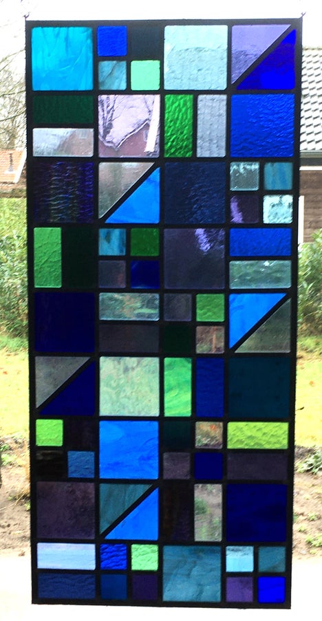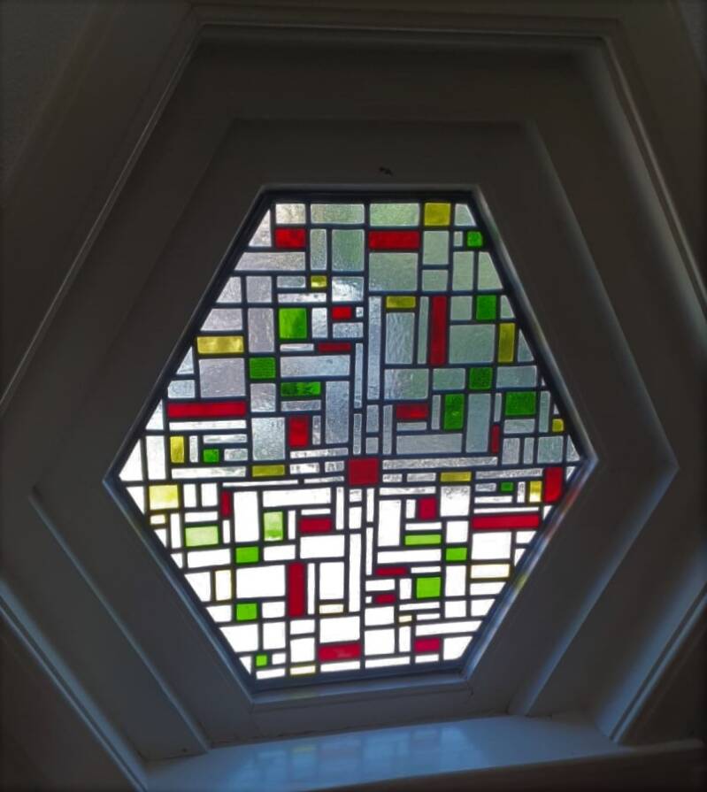 Kleine glas-in-lood raampjes van restanten glas van de glas-in-lood ramen van de Oosterkerk