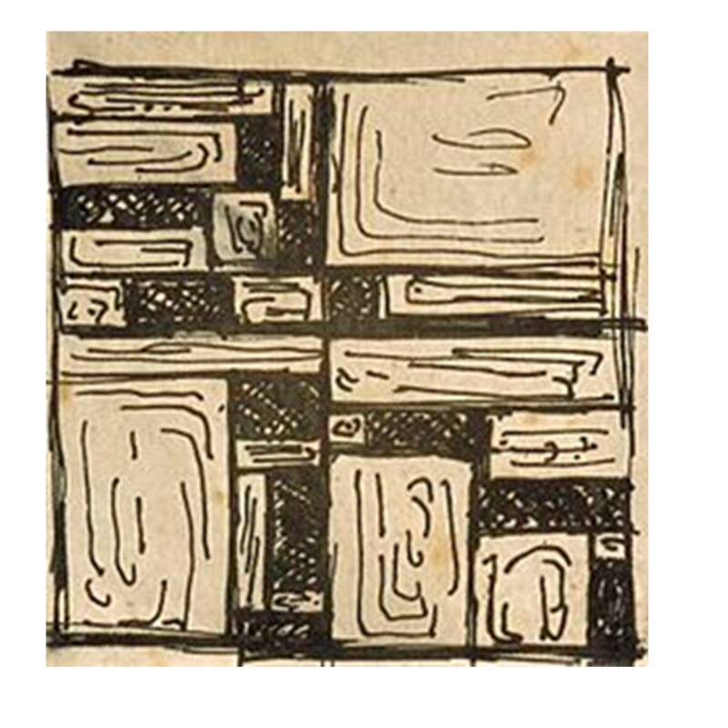 Theo van Doesburg. Studie voor glas-in-loodcompositie III. 1917. Inkt op transparant papier. 5 × 5,5 cm. Utrecht, Centraal Museum.