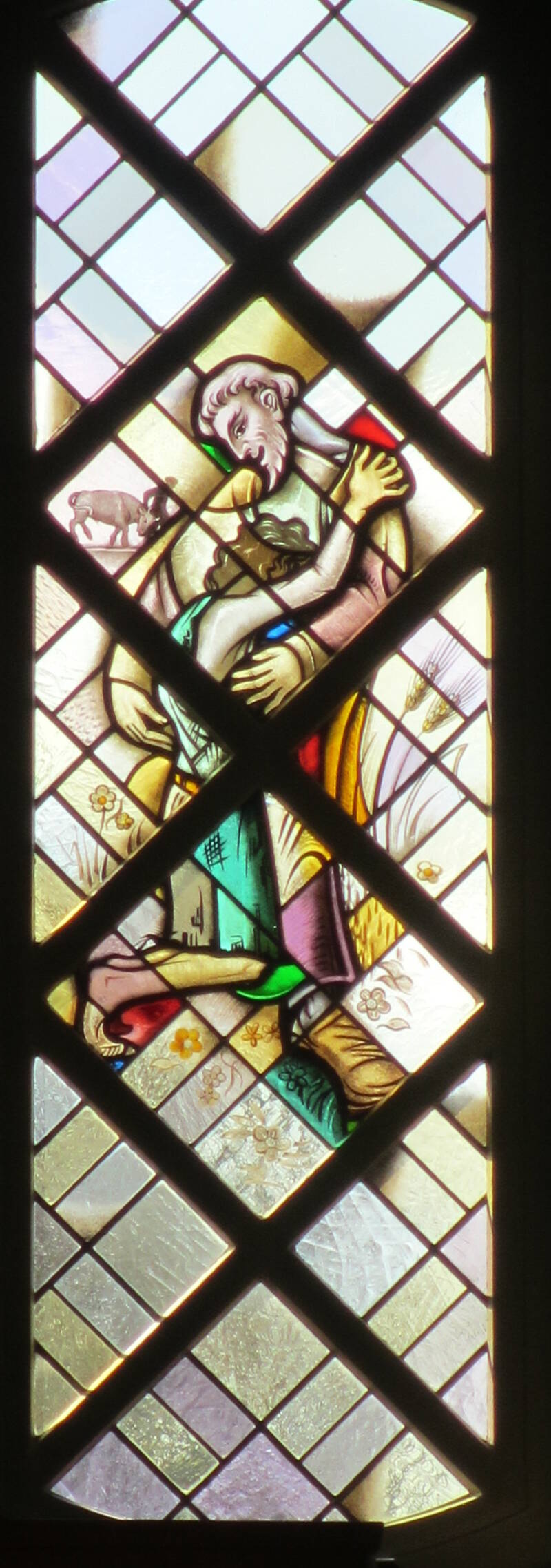 Boven in de voorgevel lange ramen met digitaal geplaatst glas-in-lood met afbeeldingen van de gelijkenis van de verloren zoon. In het linkerraam de afbeelding van de zoon die met een goedgevulde buidel op stap gaat uitgezwaaid door zijn vader. In het middelste raam de berooide zoon tussen de varkens zijn situatie overdenkend met daaronder de tekst Lucas 15:11-32 en in het rechtse raam de verloren zoon weer terug in de armen van zijn vader.