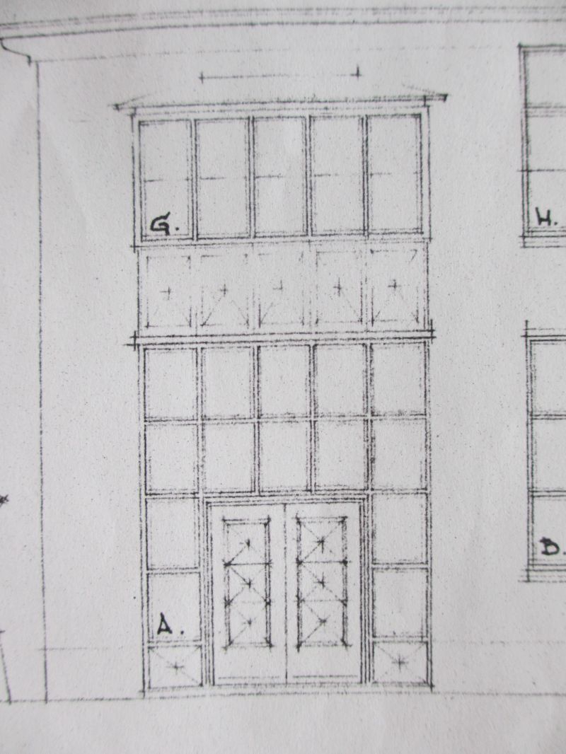 Onderstaand de bouwtekening van de hoofdingang met daarbij een oude foto.