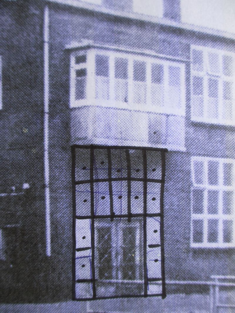 Foto van de oude ingang van de fabriek met daarin getekend de plek van de ramen waar het glas-in-lood waarschijnlijk is geplaatst.