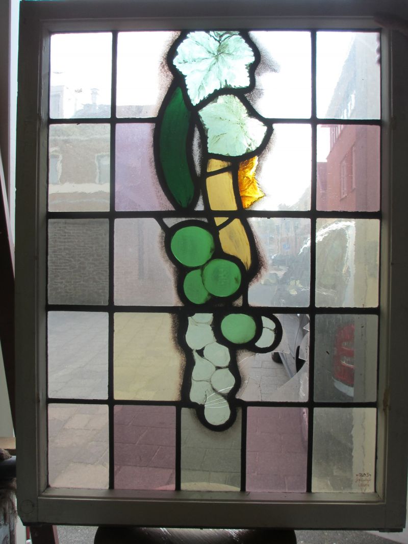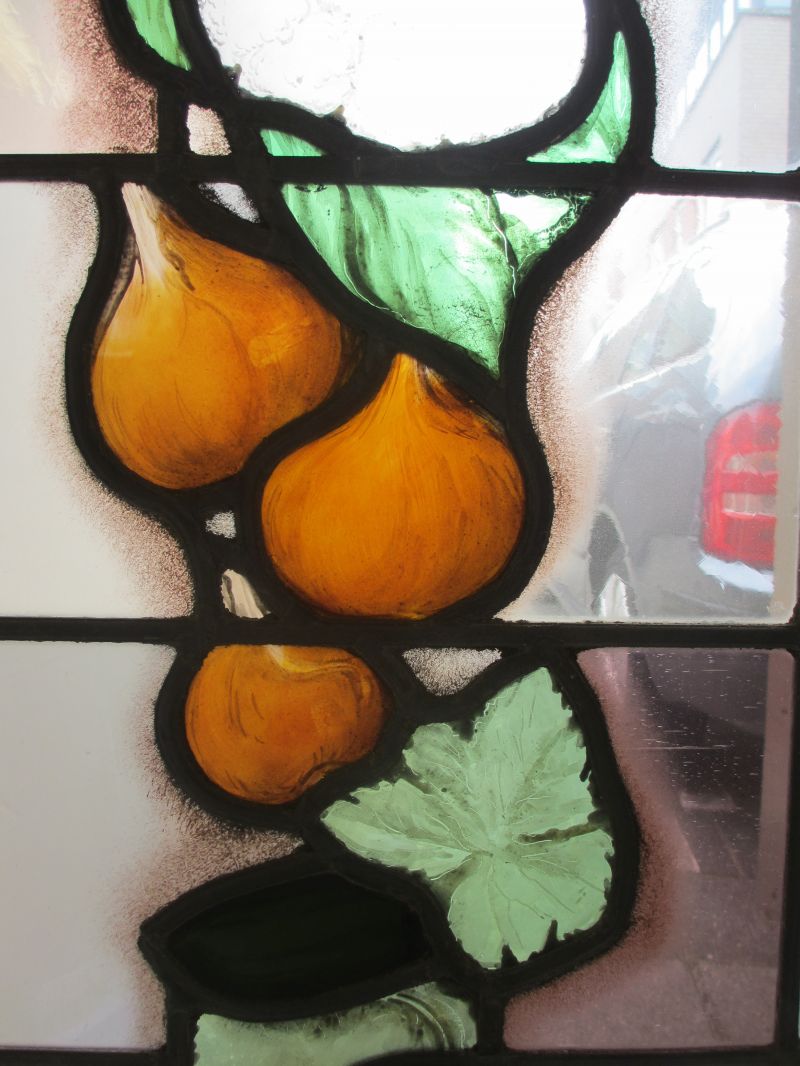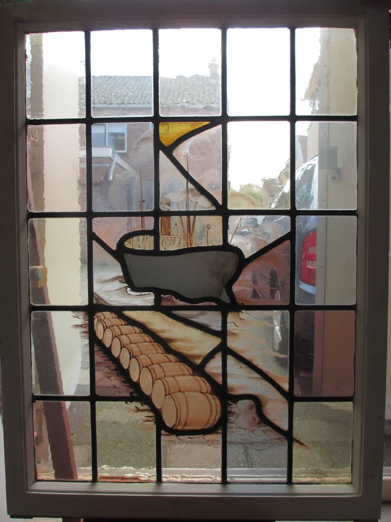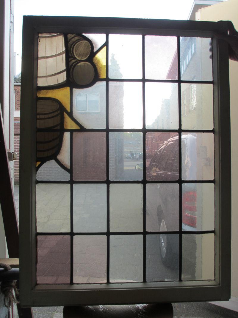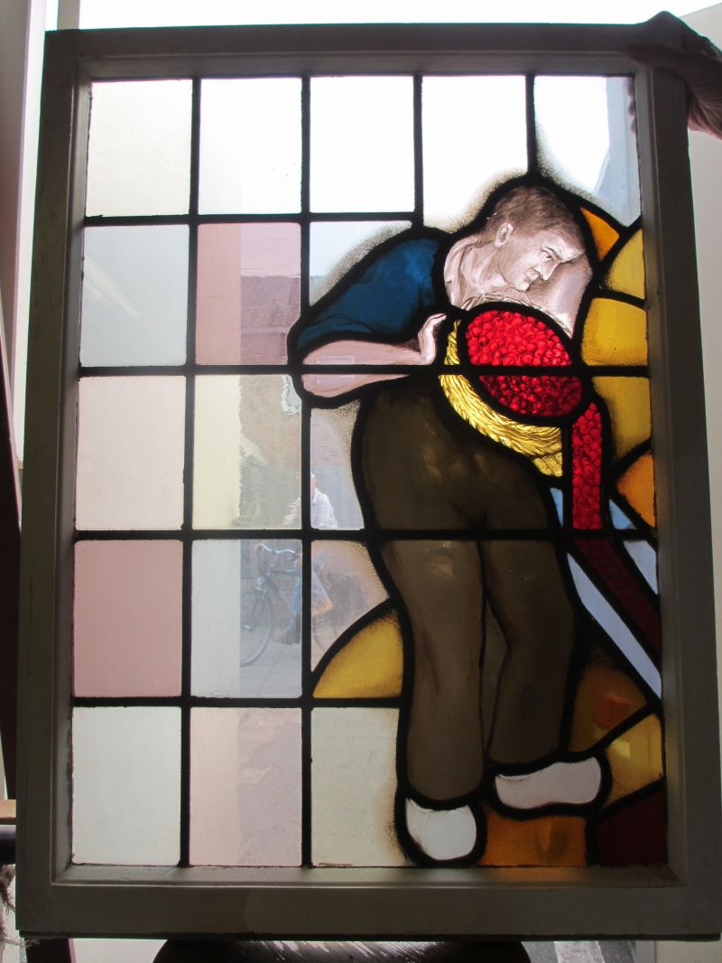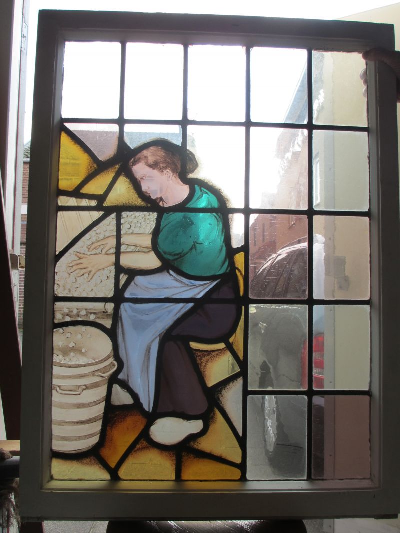 Als fanatiek glas-in-lood liefhebber maakte ik een afspraak met het museum. In een hoek van het depot waren de houten ramen met daarin glas-in-lood opgeslagen. Samen met een medewerker van het depot werden de ramen tevoorschijn gehaald en in het licht gefotografeerd. Het bleken 14 ramen te zijn met daarop de producten en de werkzaamheden gebrandschilderd.