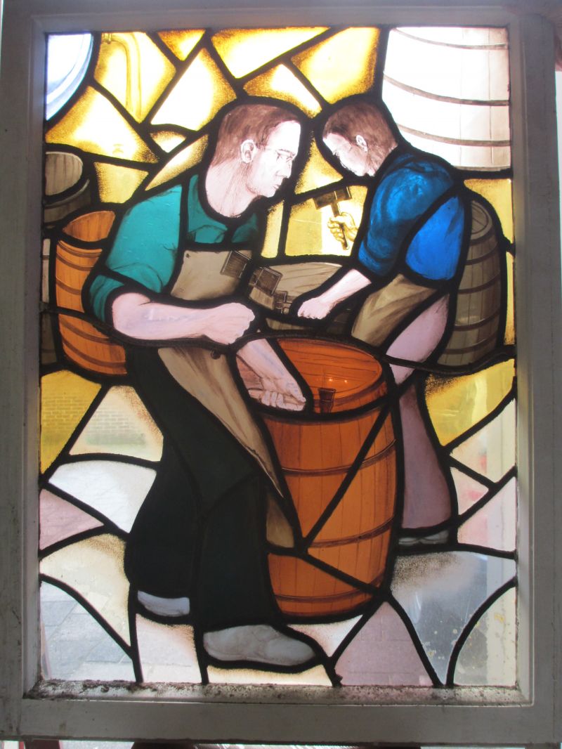 Een aantal ramen met werkzaamheden zoals sorteren van de producten door vrouwen en kuipers die de tonnen dichtsloegen.