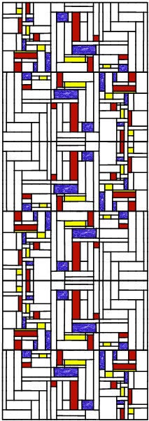 Wel schrijft Theo van Doesburg op 9 mei 1917 in een brief aan zijn vriend Antony Kok het volgende “ Ik voel me onbeschrijflijk gelukkig in de zekerheid der beeldende kunst. Ik wist niet dat de beeldende kunst iemand zoo gelukkig maken kon. Ik leef zo heerlijk mèt en ín en dóór mijn werk! Ik wilde dat je enige dagen geleden op mijn atelier waart. Ik had het grote raam 2.25 x 75 voltooid. Ik had het in zwart en wit in drie deelen boven elkaar op de muur gespannen; slechts witte vlakken ( de kleuren had ik er nog niet in ) van elkaar gescheiden door zwarte lijnen. Toen ik het geheel overzag kreeg ik ( en Lena ook ) een onbeschrijflijk schoonen indruk. Er dreunde, als ’t ware, een rhythme door van onzegbare spanning. Toen Dee Zondag kwam om het te zien zag hij dadelijk hoe ik het motief verwerkt had. Hij zei dat ik met vlakken deed wat Beethoven deed met klanken. (…) Maandag heb ik er de kleuren in gezet doch voelde het heilige van den wit en zwarte teekening verloren gaan. Nu is het bij den uitvoerder te Den Haag en zal over 10 dagen in glas en lood zijn gezet. Hoe heerlijk is dat uitzoeken van de kleuren bij de glas en lood zetter! Elke kleur wordt getoetst aan het ontwerp. Elke lijn wordt overwogen. Als het geheel af is zal ik het laten fotografeeren en stuur ik jou een fotoafdruk. Ik hoop dat de kleuren in glas zullen zeggen wat ik bedoelde. Voor mij was het zwart en wit volmaakt schoon. Alles zonk er bij in ’t niet. ( dwars in de marge :)0 Ik zal het weer in zwart en wit terug zien te krijgen door van het ontwerp alleen de teekening te calqueeren.