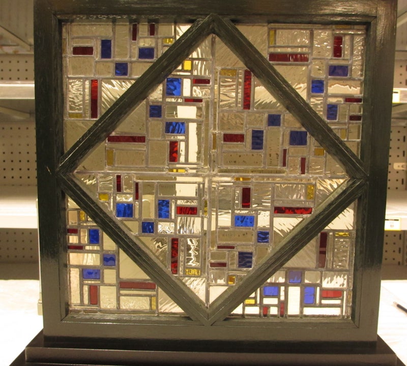 2e proefraam met blank en gekleurd gefigureerd productieglas