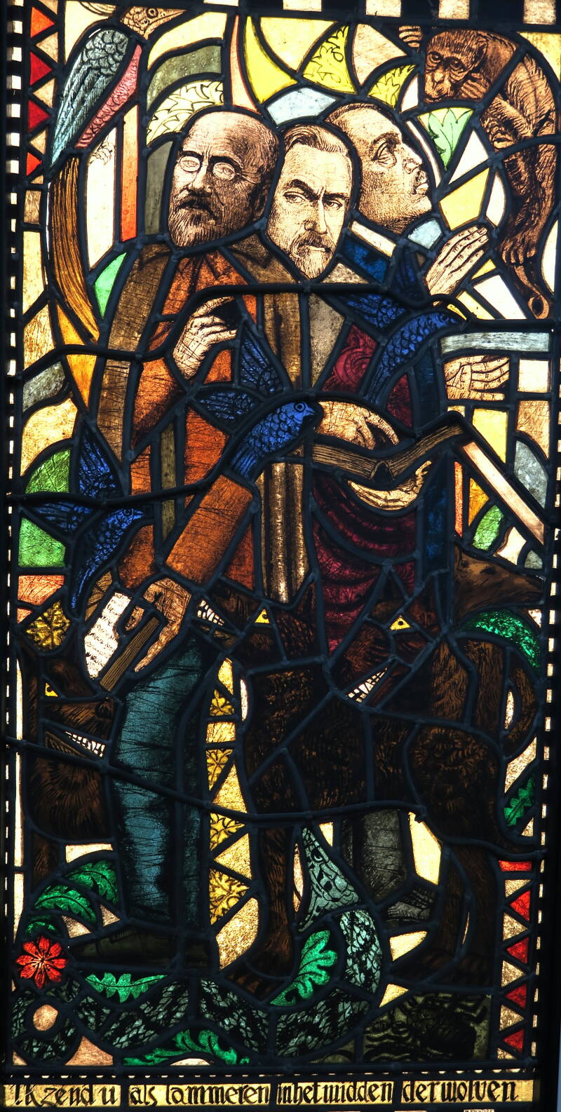 Het raam laat drie figuren zien, geplaatst in een exotische omgeving van bloemen en planten, vogels die het zaad der prediking wegnemen, omringd door wolven en tredend op slang en schorpioen. Rechtsboven een aap, symbool van de houding van vele lieden. De gelaatstrekken