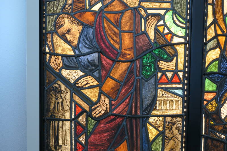 De middelste figuur is Paulus die onder de heidenen het Evangelie verkondigt. (Handelingen 9 e.v.). Zijn rechterhand geheven om zijn argumenten kracht bij te zetten, zijn linkerhand geopend omdat hij het Goede Nieuws heeft ontvangen.