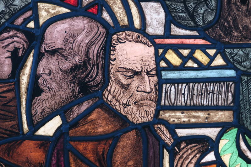 De linkse figuur is Johannes Marcus Johannes, de metgezel van Paulus en Barnabas (Handelingen 12:25). Zijn naam is samengesteld Johannes is Hebreeuws (JHWH is goedgunstig geweest) en Marcus is Romeins. Het is Marcus de evangelist, en dat is in het raam door de eerste regels van zijn Evangelie weergegeven. Ook zien we links boven de gevleugelde leeuw, het symbool voor Marcus.