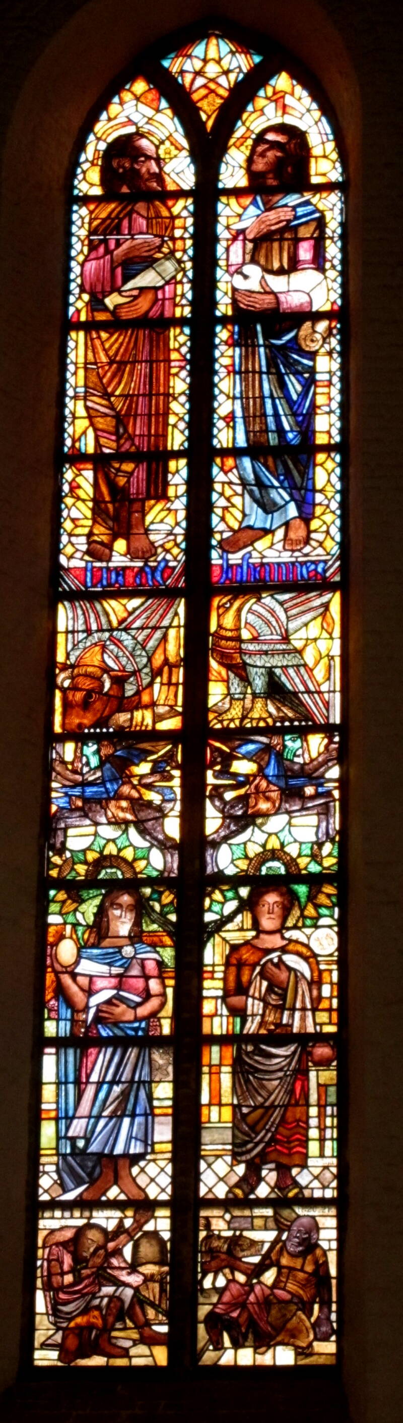rechter raam met Lucas en Johannes met daaronder Maria Magdala en Martha en helemaal onder Lazarus en de verloren zoon.